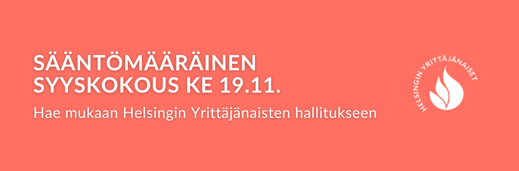 Helsingin Yrittäjänaiset ry:n hallitus kutsuu yhdistyksen jäsenet sääntömääräiseen syyskokoukseen keskiviikkona 19.11.2025 klo 18:00 osoitteessa Uudenmaankatu 23 as. 2, 00120 Helsinki. Kahvitarjoilu ja ilmoittautuminen klo 17:30-18:00.